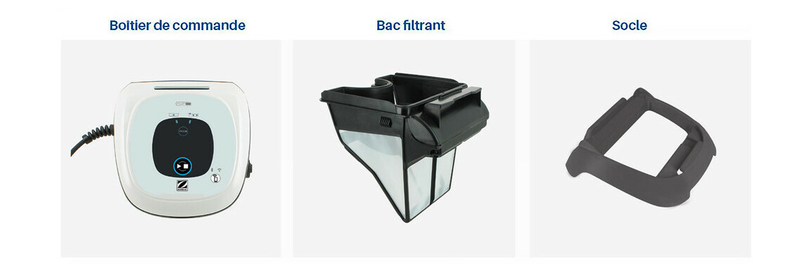 Votre robot électrique CNX2560 vous sera fourni avec son équipement de série : boîtier de commandes avec socle et son bac filtrant double niveau capacité 4L finesse 150/60 µ.