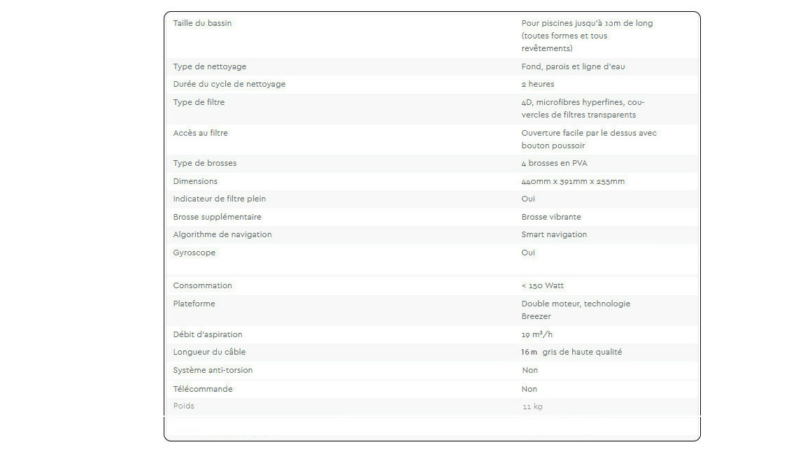 Il est compatible avec tous les types de surfaces et nettoie le fond, les parois et la ligne d'eau en seulement 2 heures.