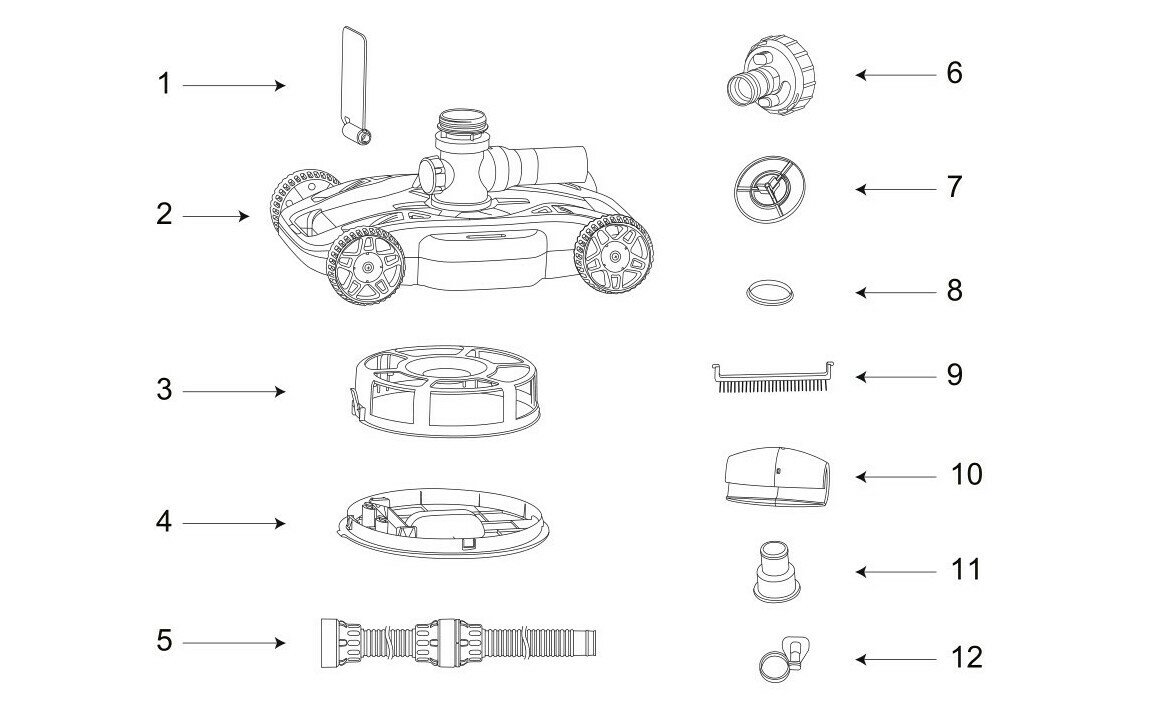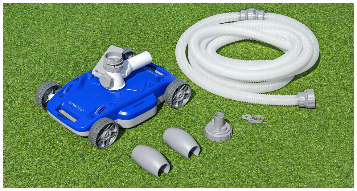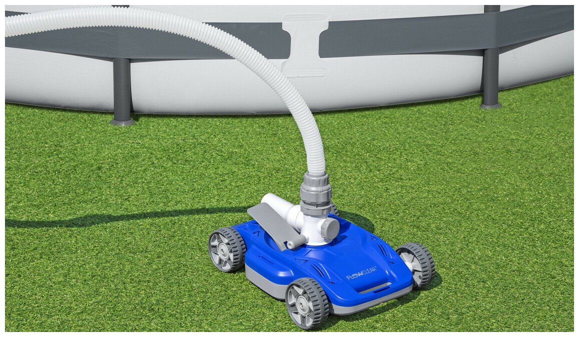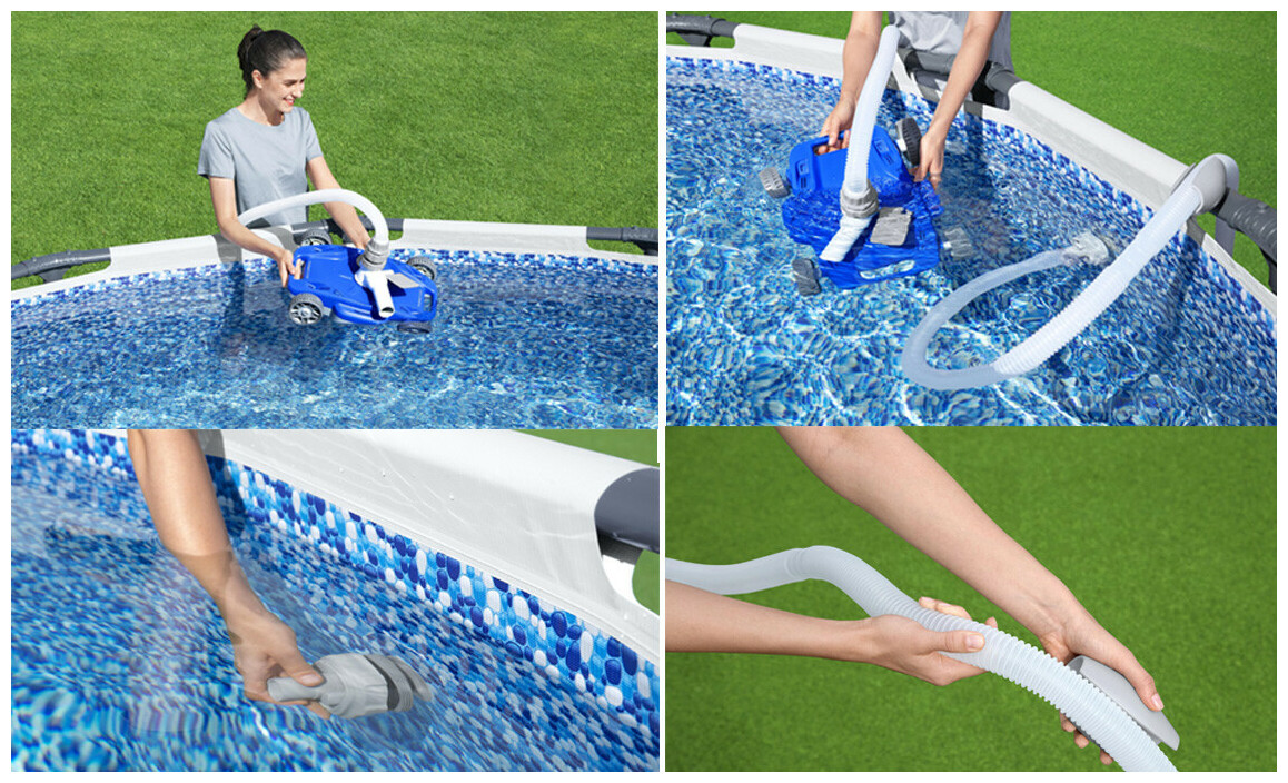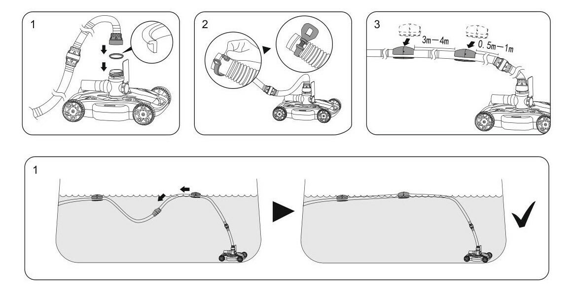 - Connectez simplement le tuyau de votre nettoyeur à la pompe, placez-le dans la piscine et le nettoyeur s'activera automatiquement, utilisant l'énergie de la pompe du filtre pour se déplacer tout seul sur le fond de la piscine.