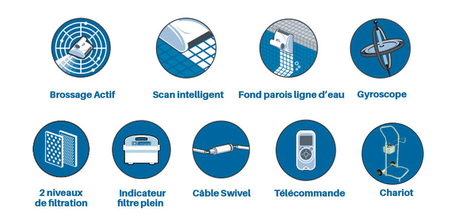 - Système Clever Clean : Balayage complet et efficace dans les moindres recoins du bassin
