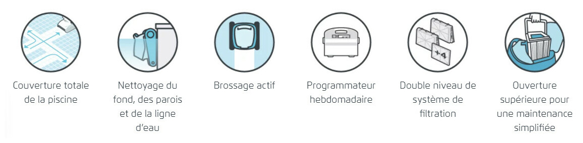 - Système de balayage unique assurant une couverture complète de tous types de bassins, y compris ceux à forme spéciale et avec obstacles.