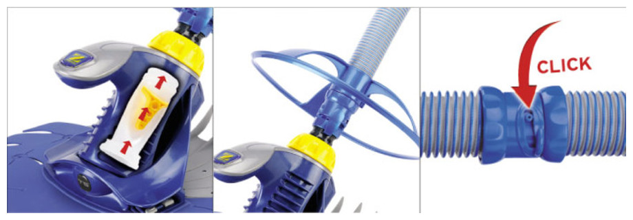 Le nettoyeur automatique Zodiac T5 se branche par l'utilisateur sur le circuit de filtration (prise balai ou skimmer) grâce à son système de raccordement Twist&Lock, qui permet une connexion facile et sécurisée.