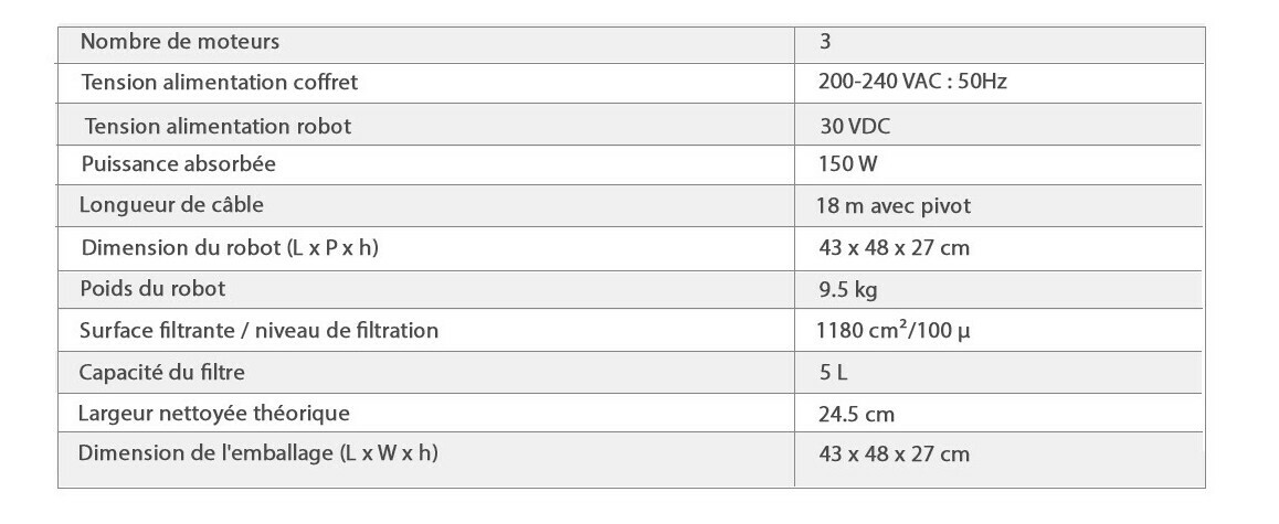 - Durée des cycles de nettoyage :1h30 (fond seul) et 2h30 (fond/parois/ligne d'eau)