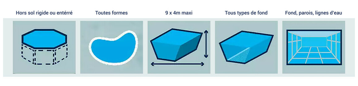 - Tous types de revêtements : (liner, PVC armé, béton peint, coque polyester, carrelage).