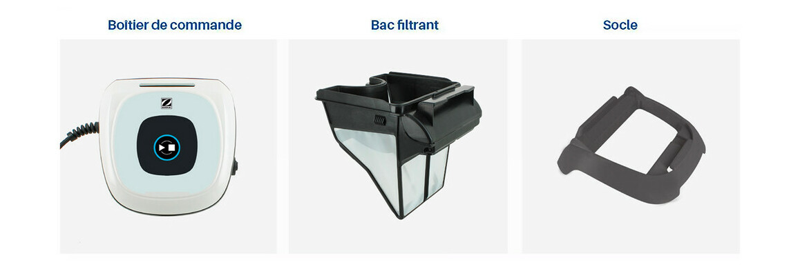 Votre robot électrique CNX1060 est fourni avec son boîtier de commandes avec socle et son bac filtrant capacité 4L d'une finesse de 100 µ.
