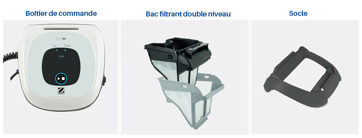 Votre robot électrique CNX30 est fourni avec son boîtier de commandes avec socle et son bac filtrant double niveau capacité 4L finesse 150/60 µ.