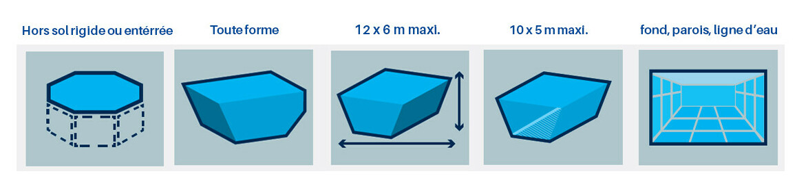 - Tous types de revêtements : (liner, PVC armé, béton peint, coque polyester, carrelage).