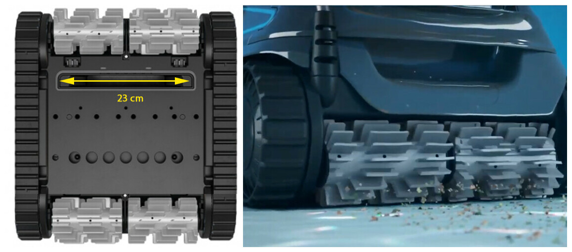 - Sécurité lors des déplacements : si le robot se soulève sur les roues arrière au cours d'une rotation, un mécanisme permet de le repositionner à plat sur le fond du bassin.