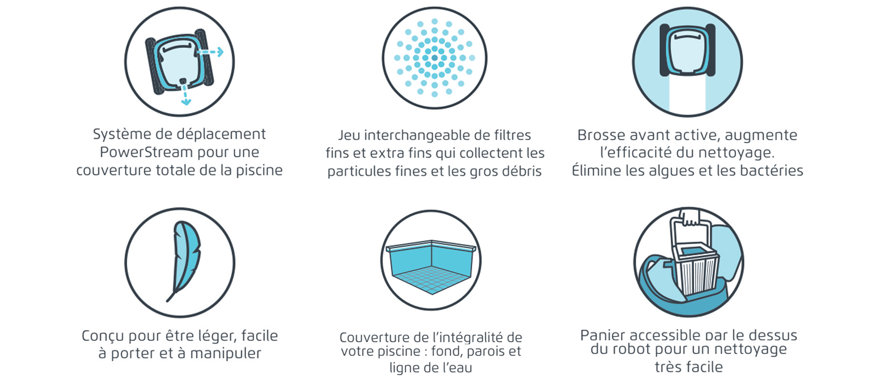 O'POOL 200 | Fond + parois + ligne d'eau | jusqu'à 12 m | 2h | Filtres fins + cartouches ultra fines | PowerStream | 18 m | 7.5 kg | Dolphin E30 / S200 |