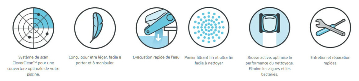 La technologie CleverClean ? : La navigation de précision : Propulsé par la technologie CleverClean ?, la couverture de votre bassin est optimisée par un système de navigation avancé et un logiciel de numérisation. Cette technologie garantit à votre robot l'itinéraire le plus efficace pour nettoyer le fond de votre piscine. Tellement intelligent, le système permet à votre nettoyeur de contourner automatiquement les obstacles et de reprendre rapidement son chemin.