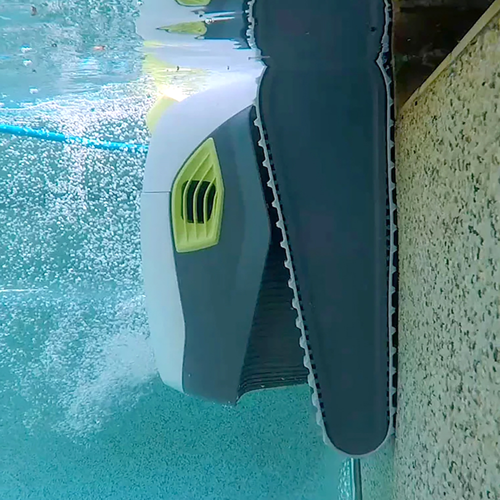 Brossage actif : Brosse avant active, Elle tourne 2 fois plus vite que la vitesse de déplacement du T30 pour améliorer le nettoyage du fond du bassin. Peu importe le revêtement, toutes les saletés, même les plus tenaces peuvent être éliminées grâce à ses lamelles et retrouver un fond impeccable !