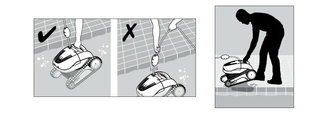 - Plonger le robot dans la piscine à l'aide de sa poignée et le laisser couler au fond