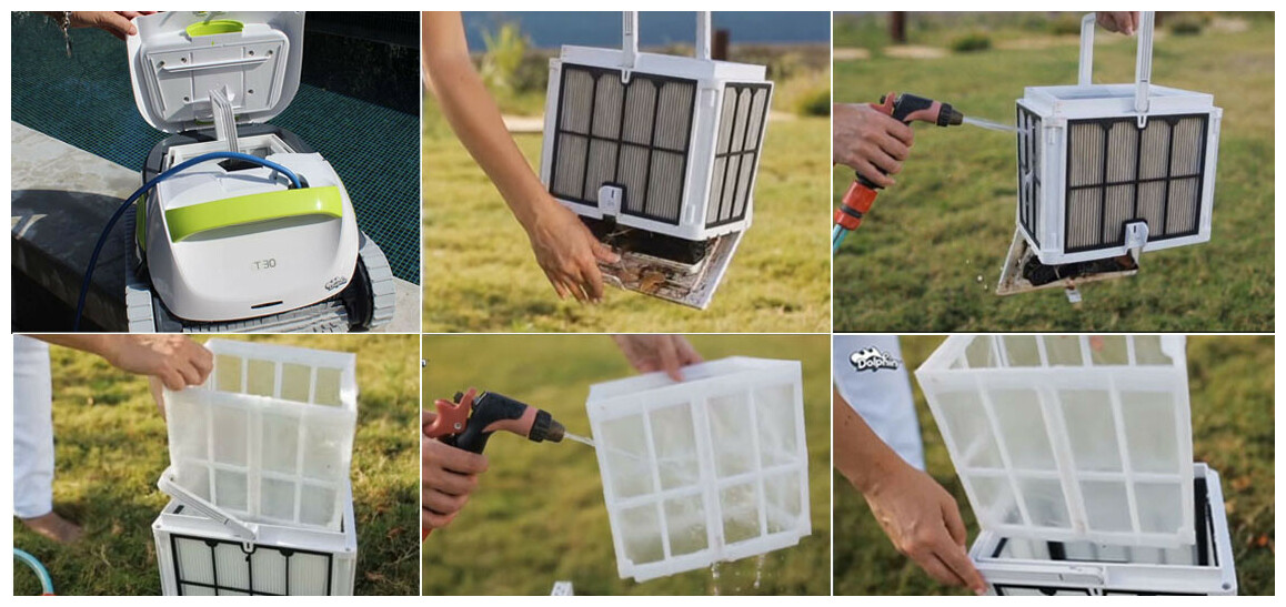Après avoir immergé le nettoyeur de piscine dans l'eau, il effectuera son travail de manière autonome en un cycle de 2 h. Les débris et les particules sont collectés dans un filtre amovible avec des panneaux interchangeables sur le dessus.