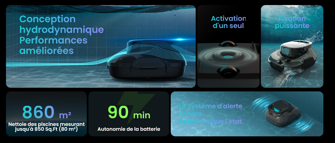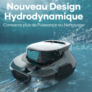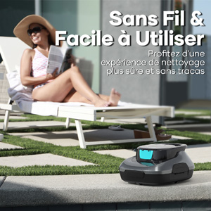 Grâce à sa conception hydrodynamique brevetée, sa puissance d'aspiration de 4500 L/h et son système d'activation en un seul clic, il nettoie le fond de votre piscine jusqu'à 9 m (80 m²) en toute autonomie, sans câble, sans prise de tête.