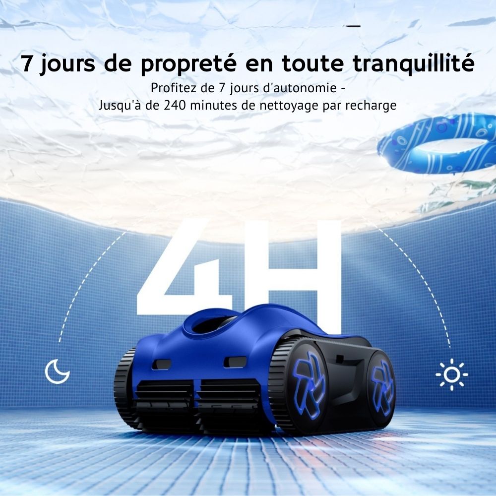 NB : Tests réalisés dans une piscine propre de 3 m x 8 m rectangulaire en conditions maîtrisées de laboratoire. L'autonomie peut varier selon la taille du bassin, sa configuration et la qualité de l'eau.