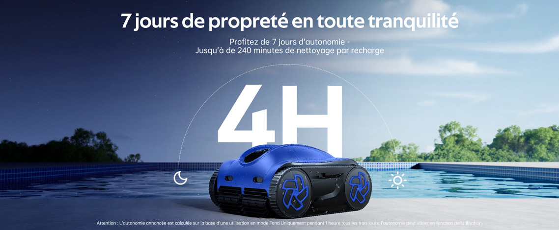 NB : Tests réalisés dans une piscine propre de 3 m x 8 m rectangulaire en conditions maîtrisées de laboratoire. L'autonomie peut varier selon la taille du bassin, sa configuration et la qualité de l'eau.