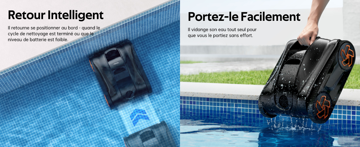 Il retourne également seul au bord du bassin à la fin du cycle ou lorsque la batterie est faible.