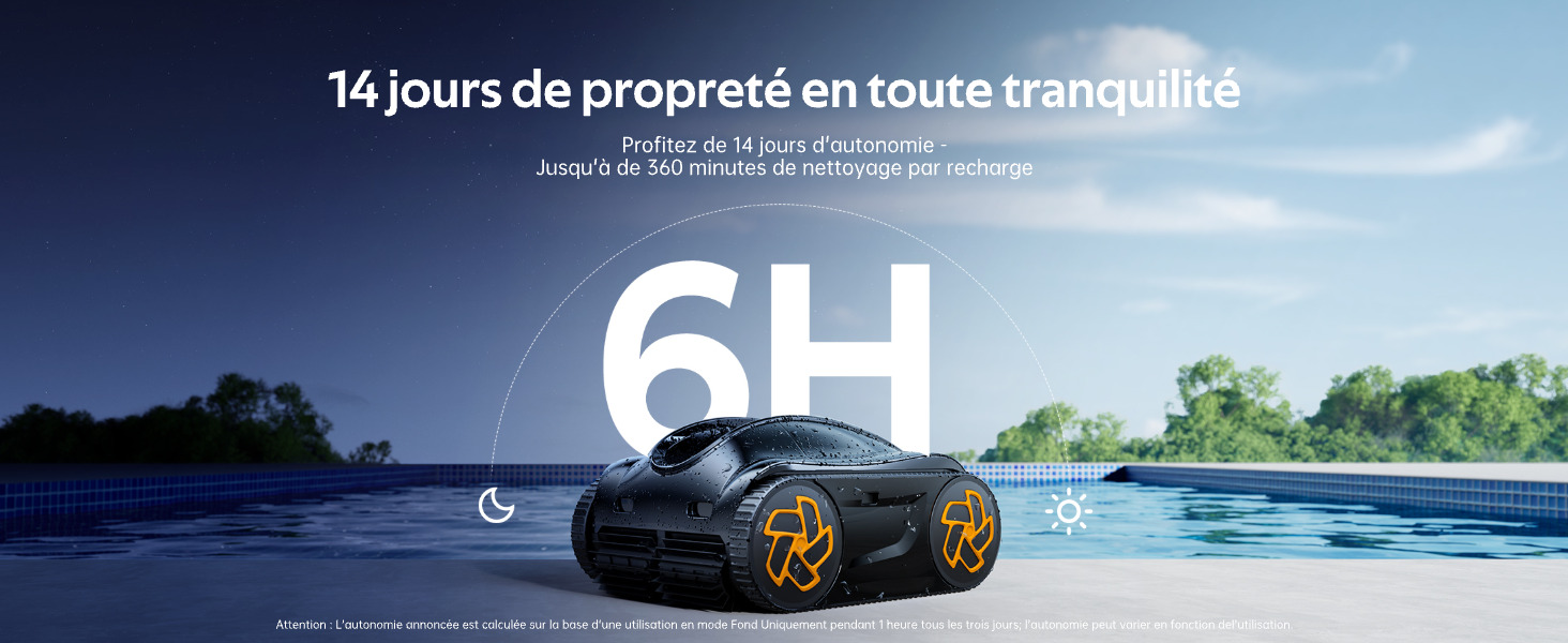 Modes de nettoyage | Fond uniquement : 6 h - Fond, parois, ligne d'eau : 3.5 h |