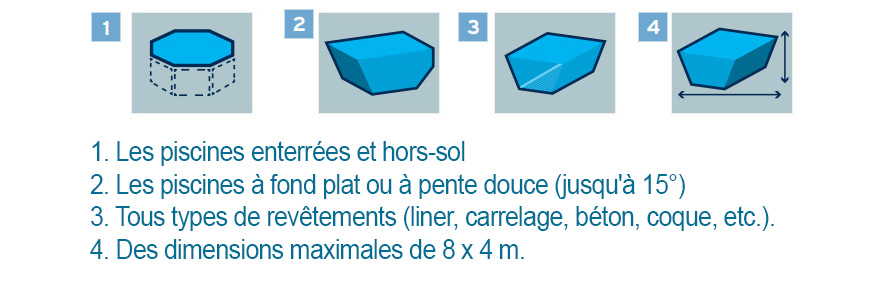 Taille de piscine max. | Jusqu'à 8 x 4 m |