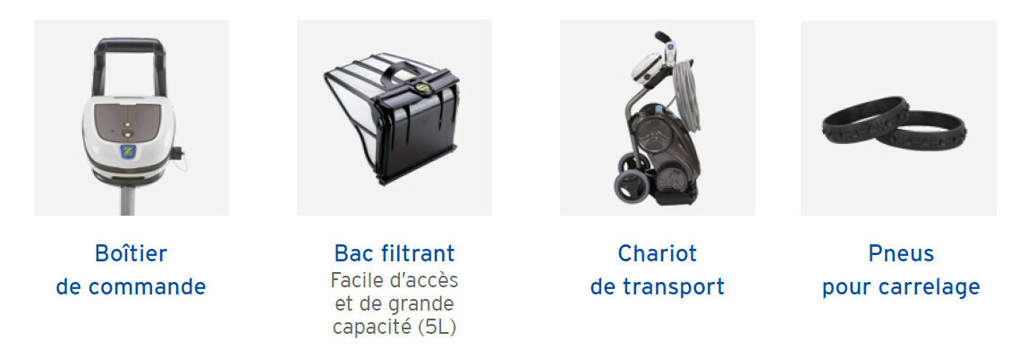 Son chariot de transport et de stockage, son coffret de commande, un câble électrique, une paire de brosses à lamelles, et un bac de filtration grande capacité.