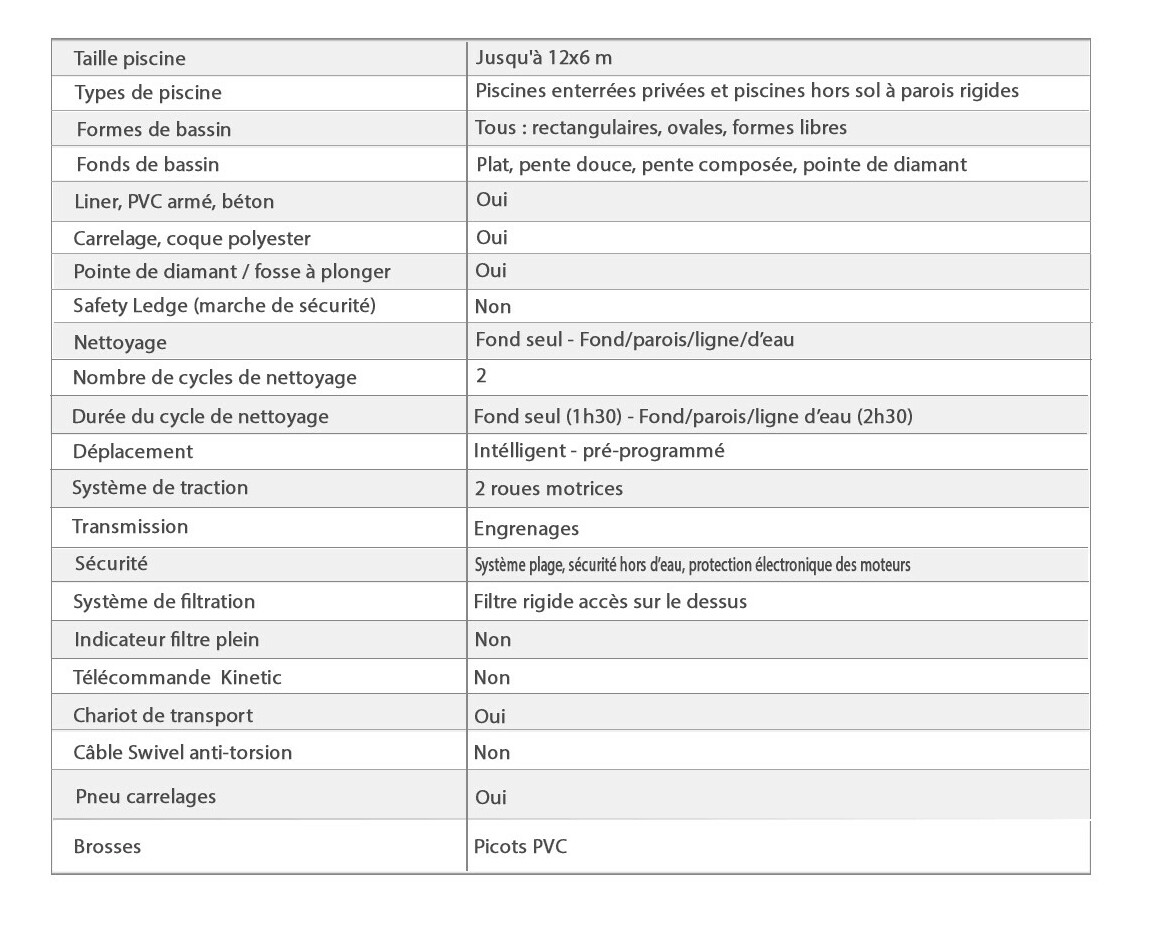 - Sécurité plage immergée : équipé d'un détecteur qui lui permet de faire demi-tour dans le cas d'une sortie de bassin.