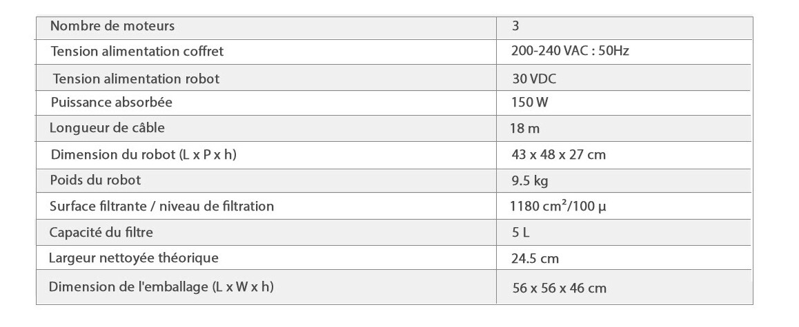- Durée des cycles de nettoyage : 1h30 (fond) et 2h30 (fond/parois/ligne d'eau)