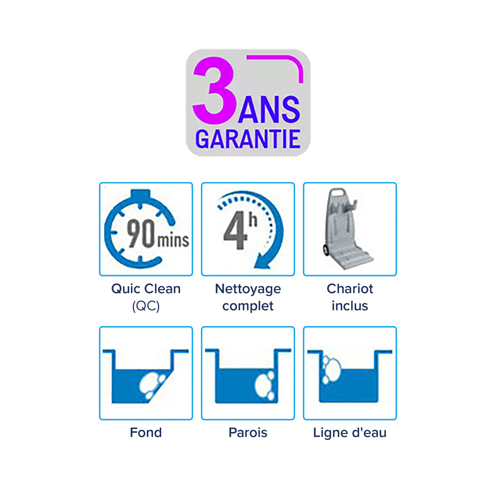 - Solution complète : nettoie et aspire le fond de la piscine, les parois et la ligne d'eau en 4 heures seulement.
