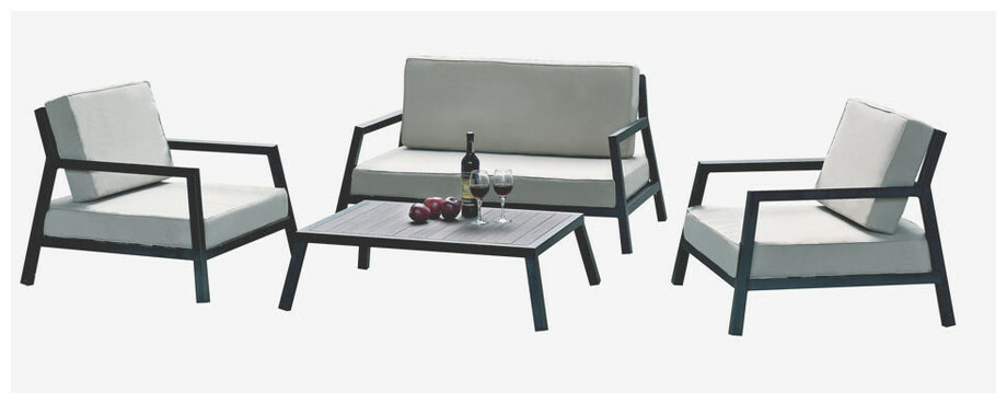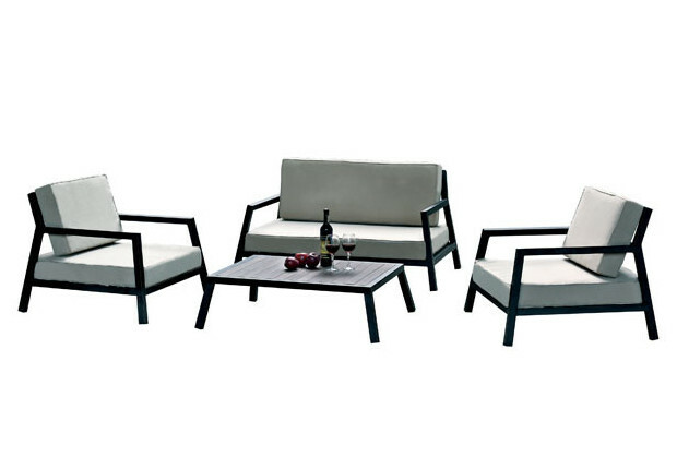 Composé d'un canapé 2 places, de 2 fauteuils, aux coussins écru, et d'une table basse en composite naturel, il fera de votre extérieur un lieu cosy et épuré.