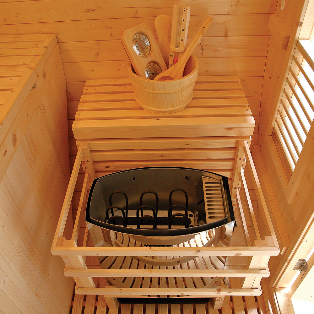 - Compatibilité poêle : Prévu pour accueillir un poêle électrique (non fourni), avec une puissance recommandée entre 4.5 et 8 kW, accompagné de pierres de lave pour générer la vapeur.