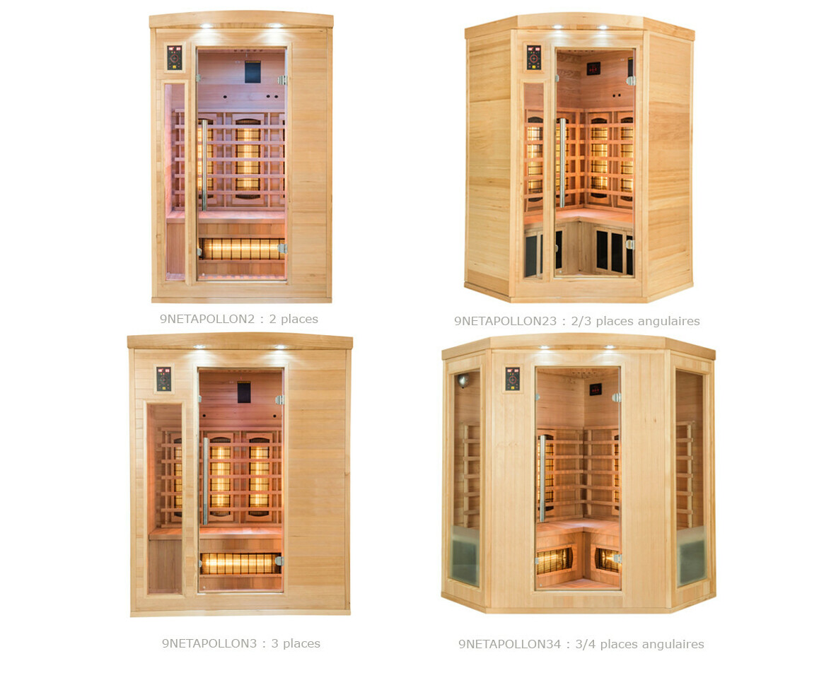 La cabine sauna infrarouge Apollon Quartz est disponible en 2 places, 2/3 places angulaires, 3 places et 3/4 places angulaires.