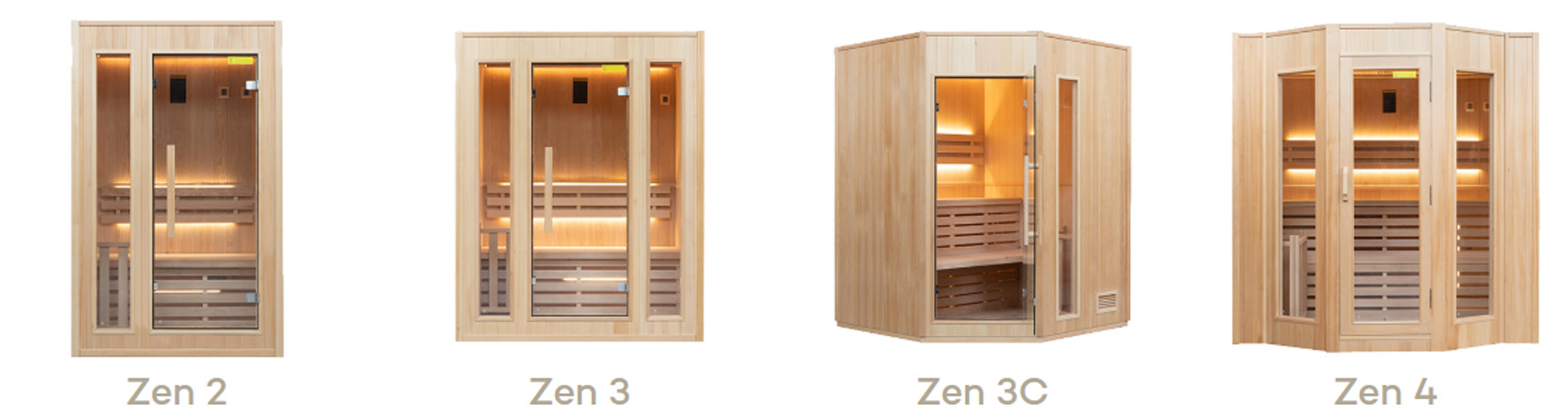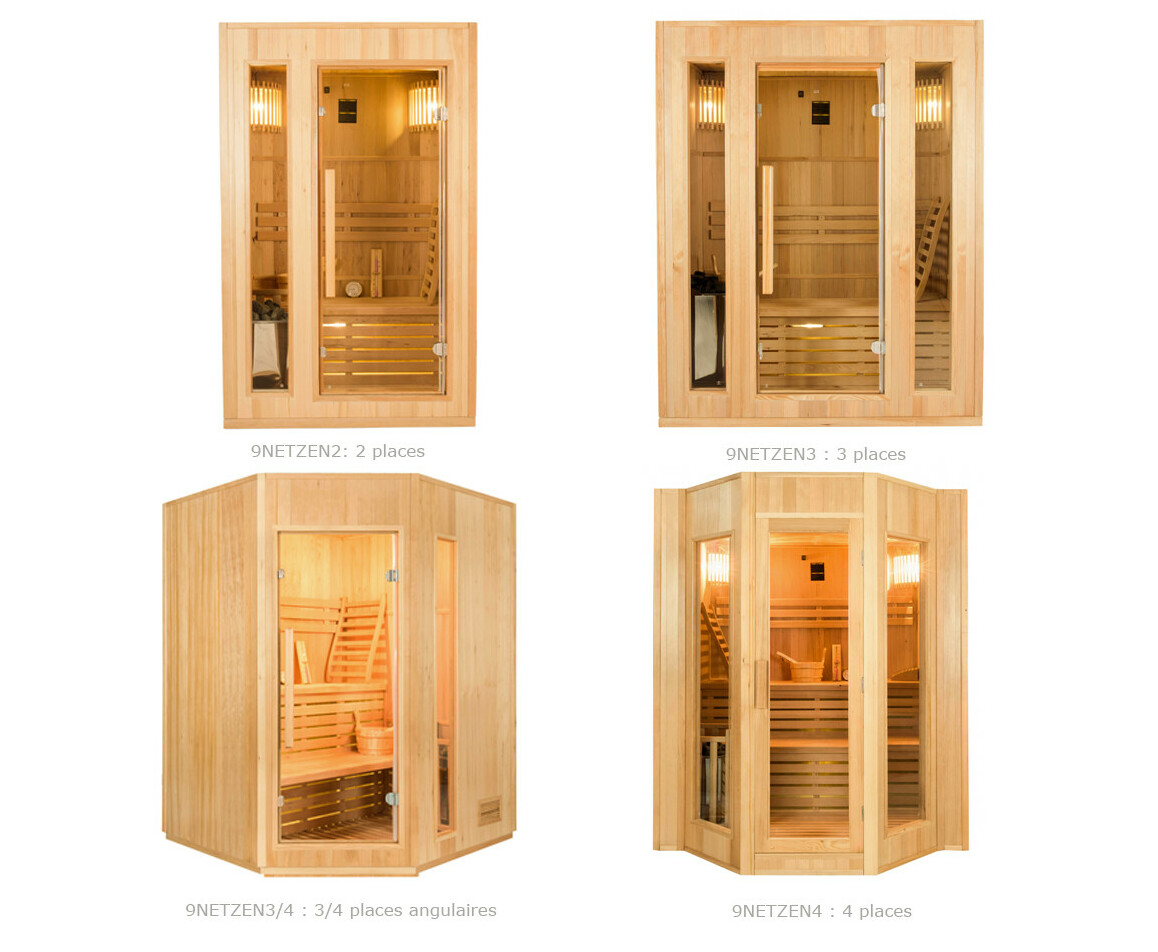 Deux hauteurs de banc permettent de varier la chaleur : plus doux en bas, plus intense en haut.. Le modèle Zen inclut un éclairage LED pour créer une ambiance relaxante.