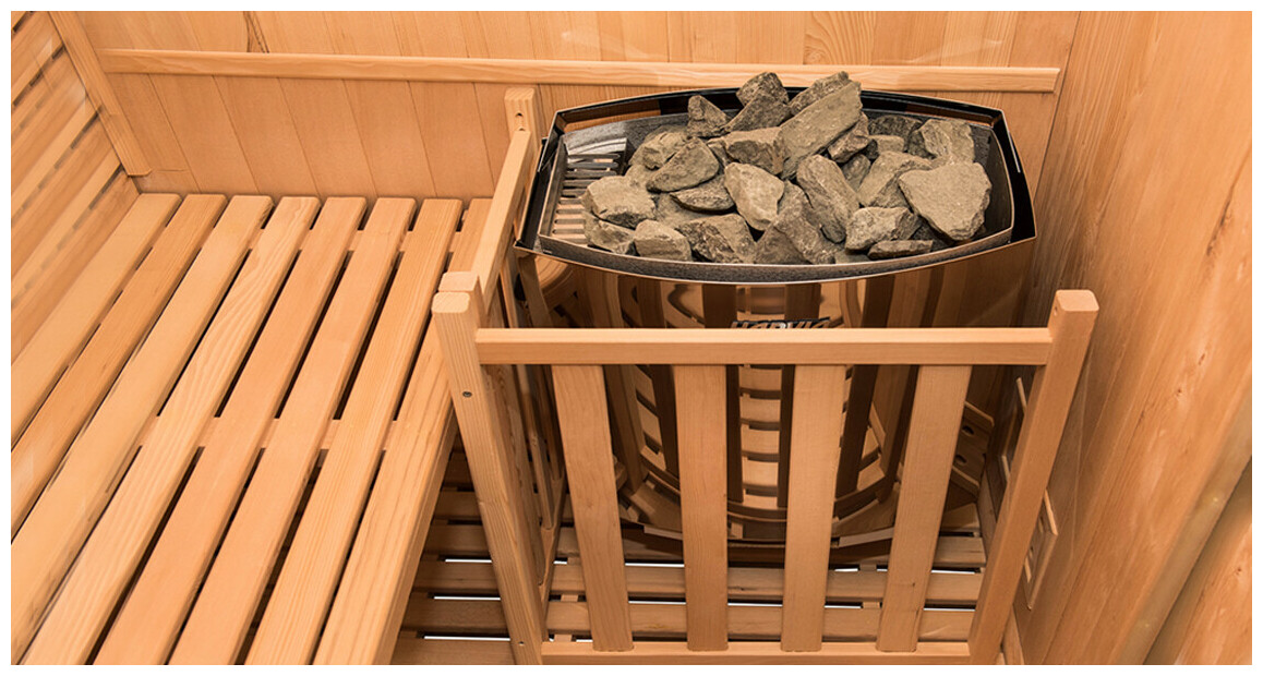 Le poêle Harvia, reconnu mondialement pour sa qualité, garantit une chauffe rapide et régulière. Les pierres de lave incluses renforcent l'efficacité thermique et la création de vapeur.