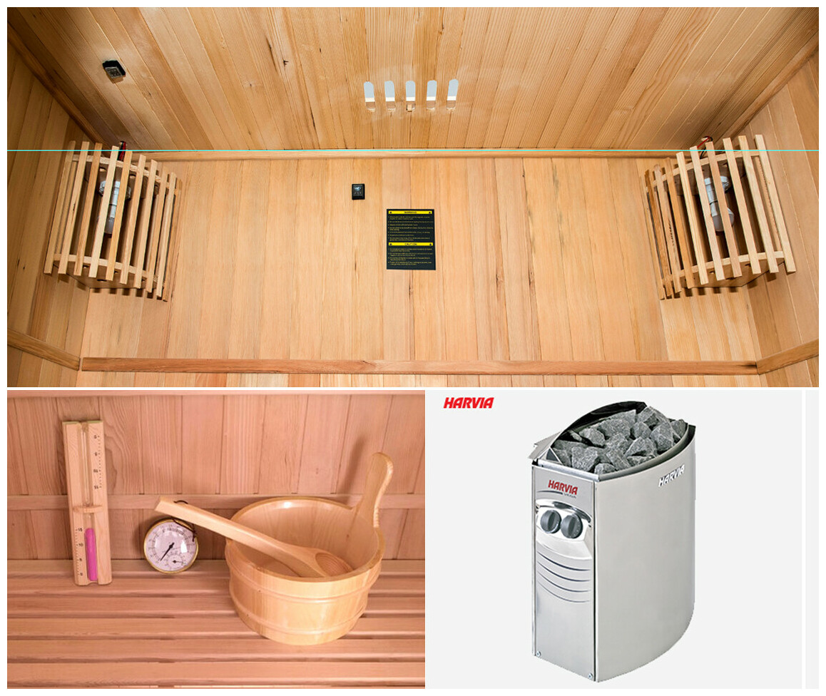 Son kit d?accessoires inclus le seau, la louche, le thermomètre et l?hygromètre. Pour assurer une température idéale, le poêle Harvia est inclus ainsi que 20kg de pierres de lave.