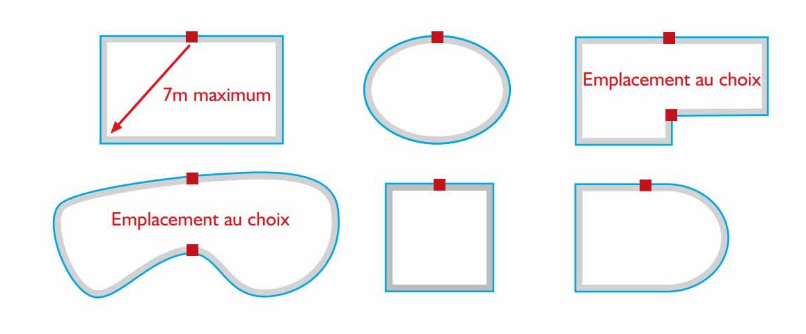 - L'emplacement idéal se trouve au milieu de la longueur la plus grande (piscine rectangulaire).