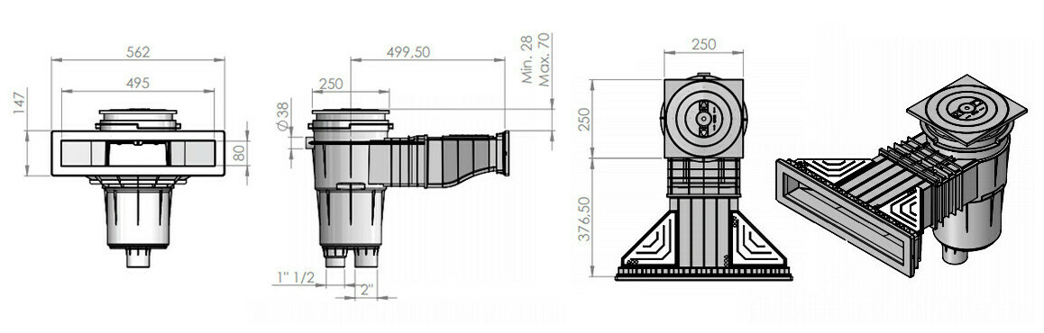 - Raccordement : sortie inférieure d'aspiration à visser, femelle 1"1/2 et mâle 2" - Connexion simultanée à la bonde Ø50 mm - Connexion de trop-plein Ø40 mm