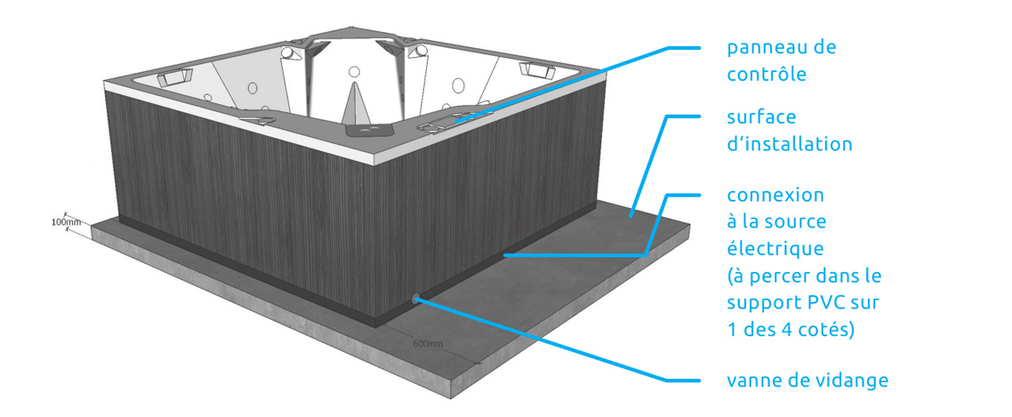 Dans tous les cas, l'installation doit reposer sur une base plane, stable et supportant le poids total du spa.