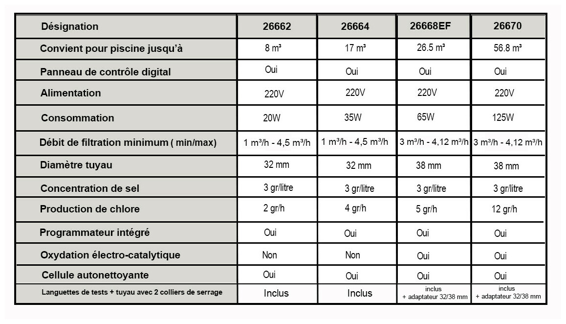 L'électrolyseur au sel QS pour piscines hors-sol existe en 4 versions, pour piscines jusqu'à 56.8 m³ maximum.