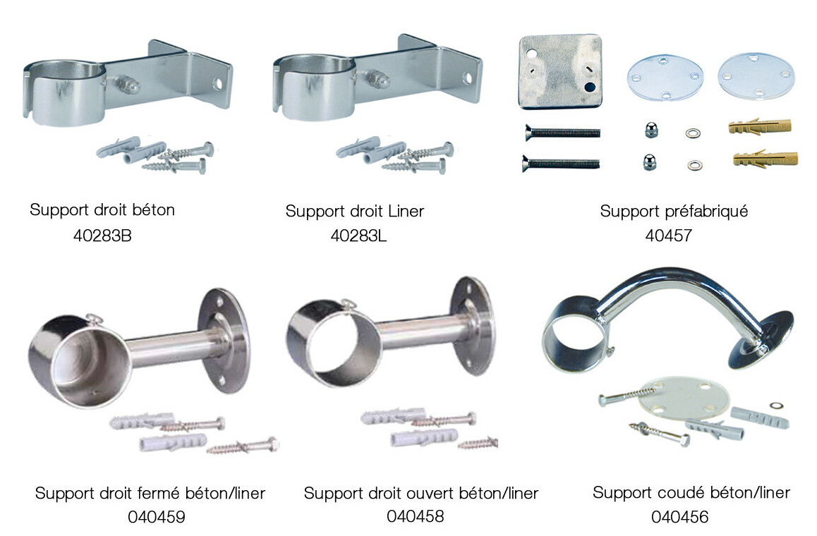 Nous vous proposons une sélection de supports qui s'adapteront à votre revêtement piscine, à sa forme, et à votre barre de maintien inox :