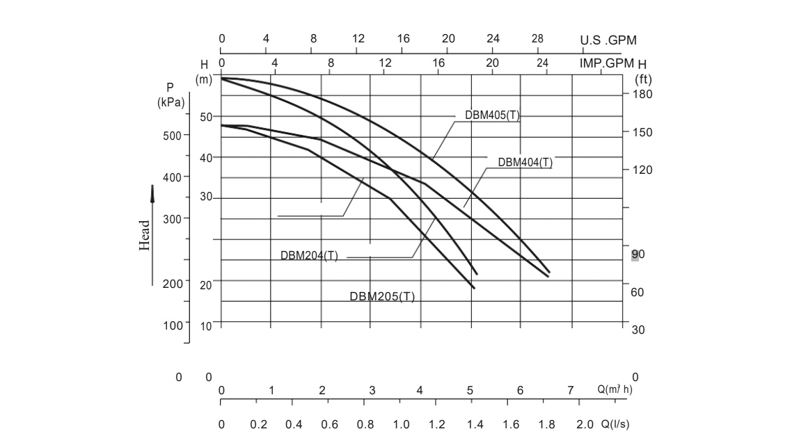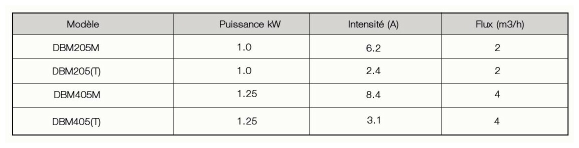 Débit (m³/h) | DBM204 | DBM204T | DBM405 | DBM405T |