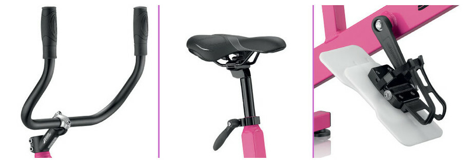 Réglages : selle réglable en hauteur par collier à blocage rapide, guidon aluminium réversible, pales de résistance coulissantes