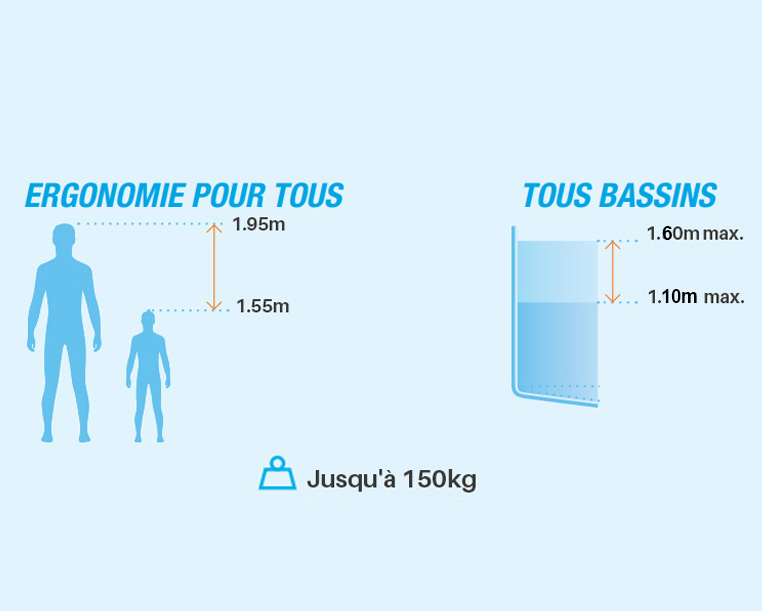 - Type de revêtement : S'adapte à tous les types (liner, PVC, carrelage, coque, polyester...)