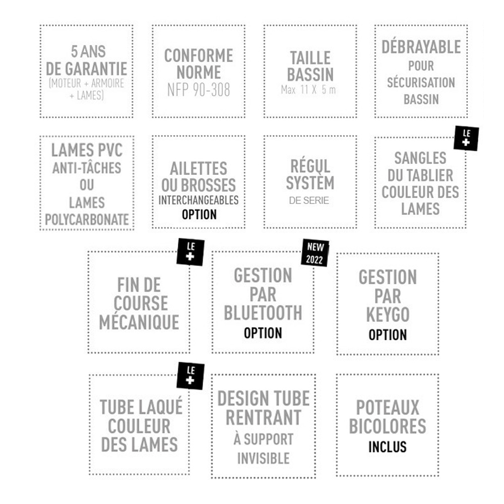 - Réduction des besoins d'entretien grâce au volet PVC qui limite la chute de débris dans l'eau.