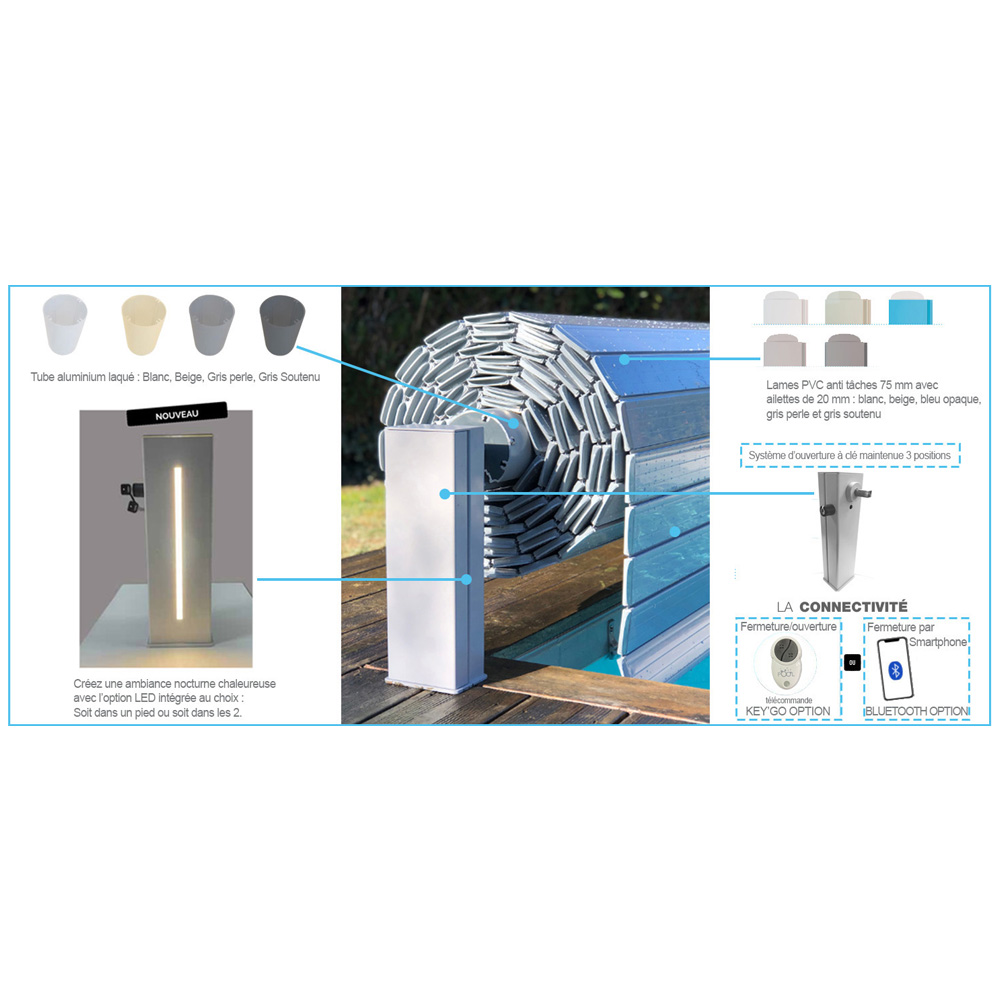 - Facilité d'utilisation : Contrôlez facilement l'ouverture et la fermeture du volet ainsi que l'ambiance de votre espace piscine directement depuis votre smartphone grâce à une interface intuitive avec l'Option Bluetooth.