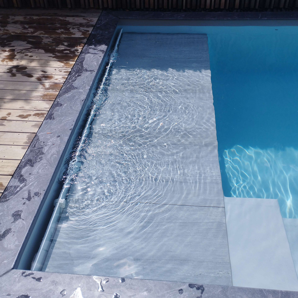 Lorsque le volet immergé Wood est placé horizontalement sur la largeur du bassin, il est adapté à différentes configurations d'escaliers, qu'ils soient romains, droits, de forme libre ou trapézoïdaux.