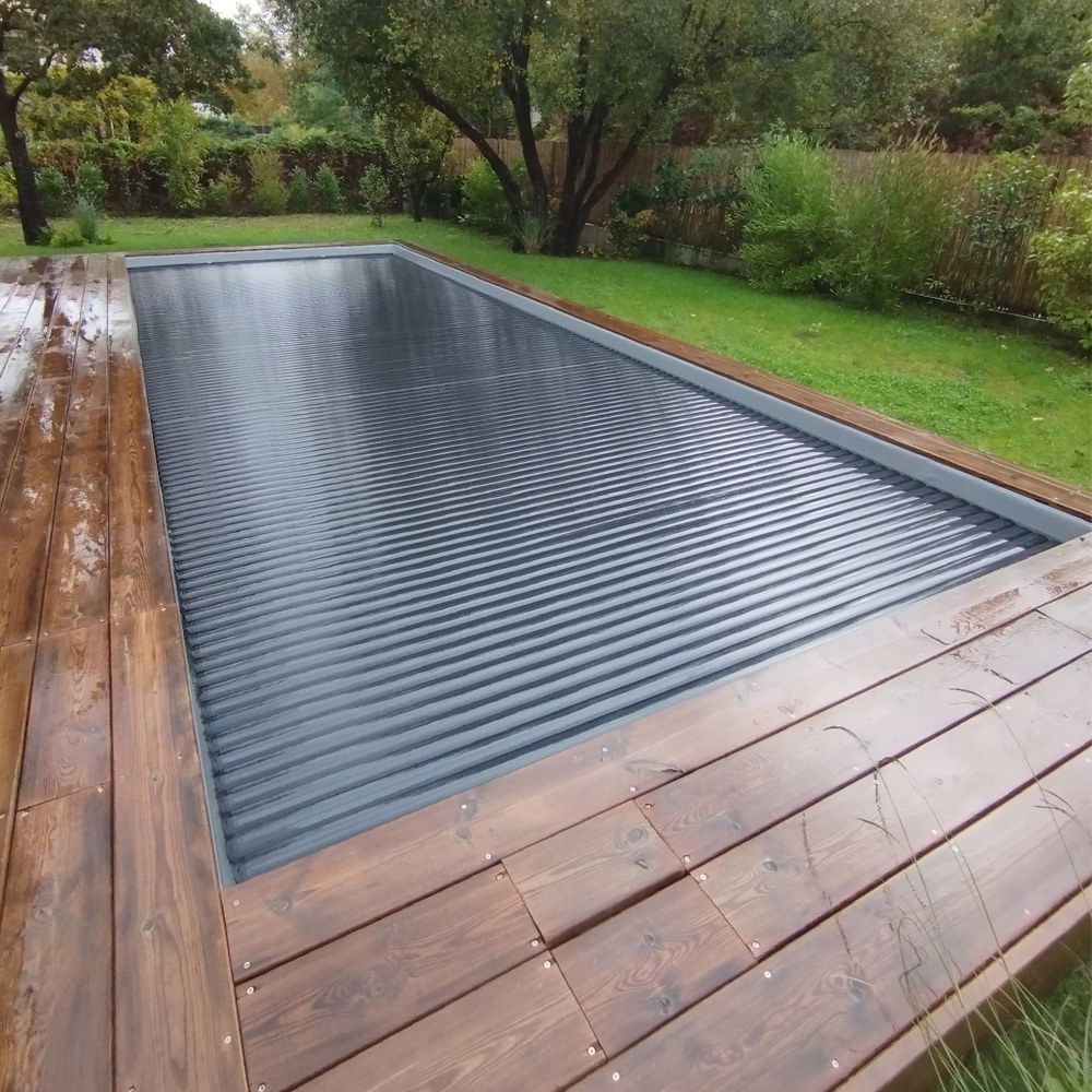 Le tablier est constitué de lames et de bouchons, ce qui en fait l'élément esthétique primordial de votre couverture de piscine. Sa forme, sa finition et sa couleur sont cruciales pour son harmonie parfaite avec votre environnement piscine.