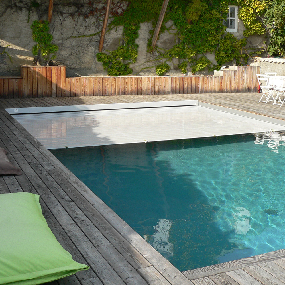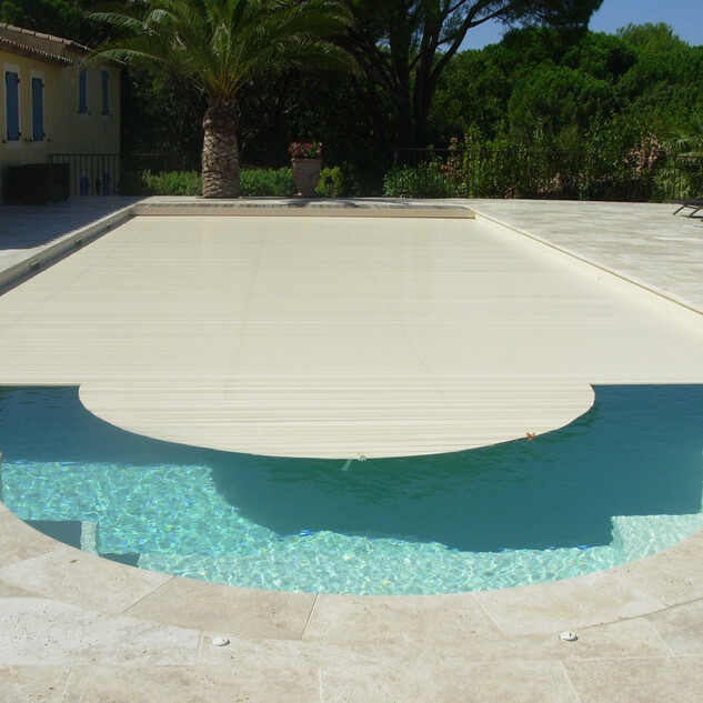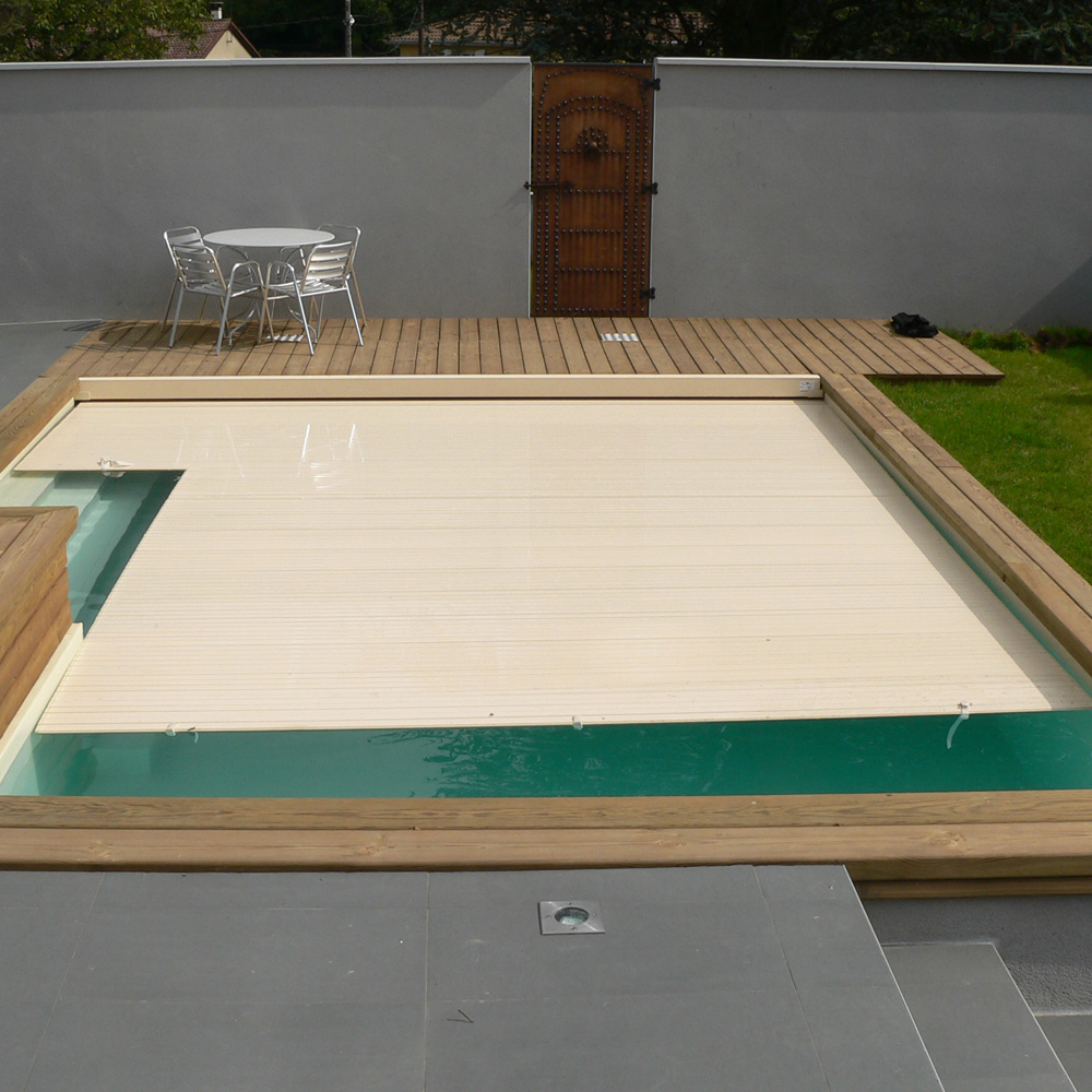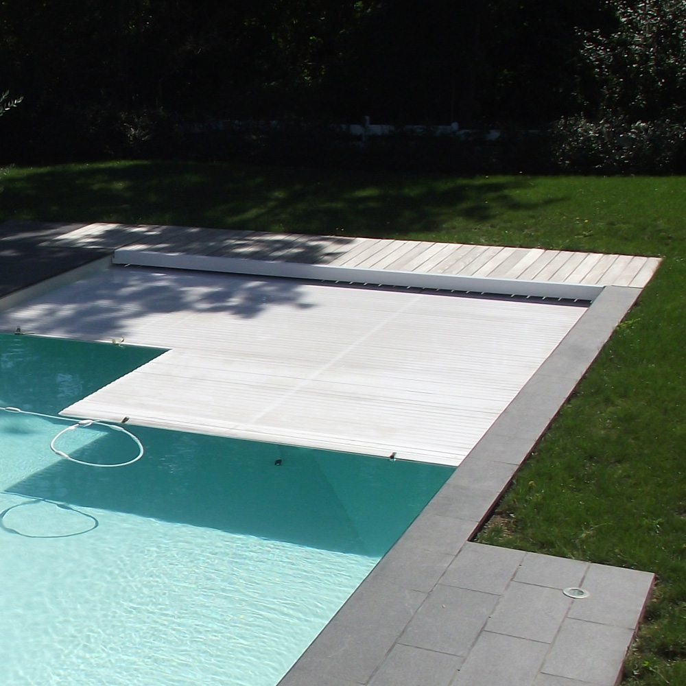 Le tablier est constitué de lames et de bouchons, ce qui en fait l'élément esthétique primordial de votre couverture de piscine. Sa forme, sa finition et sa couleur sont cruciales pour son harmonie parfaite avec votre environnement piscine.