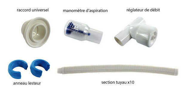 Le nettoyeur hydraulique X8 est livré avec les accessoires indispensables à son raccordement et à son fonctionnement optimal : tuyaux d'aspiration, manomètre, régulateur de débit, raccord universel et anneaux lesteurs pour tuyau.
